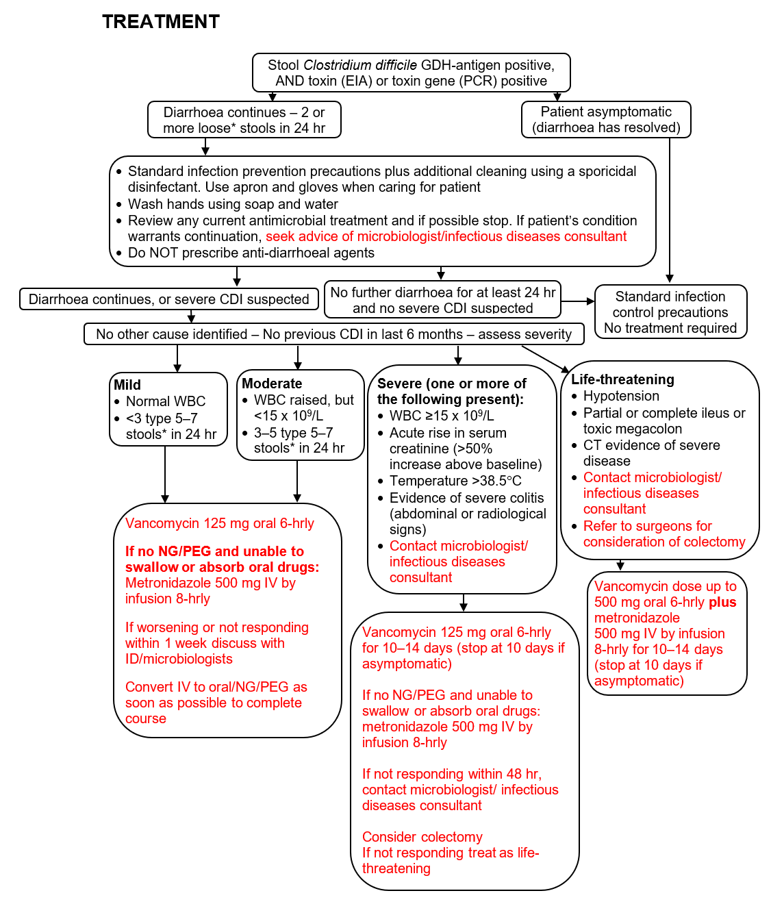 - If mild/moderate CDI deteriorates, or if diarrhoea fails to respond to antimicrobial treatment of CDI for>5 days, discuss with microbiologist/ ID consultant